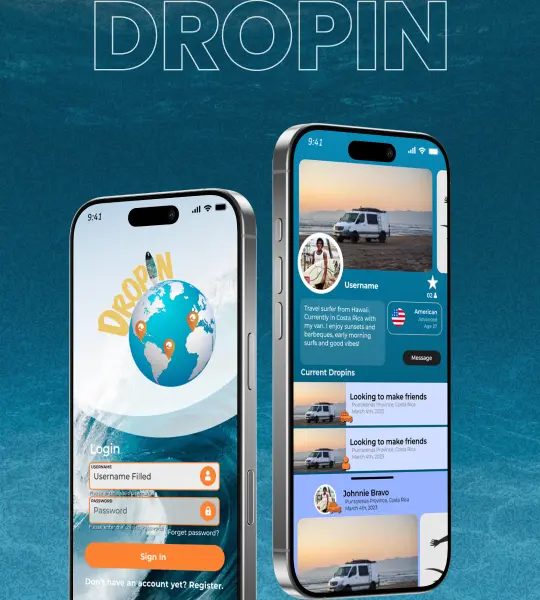 DropIn is a unique mobile application built for surfers, surf communities, and surf-related businesses.The platform allows users to connect, share experiences, discover services, and explore local surf spots. With an interactive map, social news feed, event posting, and in-app chat, DropIn enhances how surfers engage with each other and the surfing ecosystem.